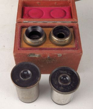 VINTAGE ERNST LEITZ MONOCULAR MICROSCOPE, no. 151471, lacquered brass with two eyepieces and three objective lenses, in original mahogany numbered case, 27cms h