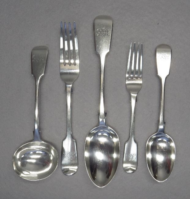 VICTORIAN 46pc SILVER FIDDLE PATTERN FLATWARE SERVICE, mostly London 1879-80 by mostly George Adams, comprising eighteen table forks, eight dessert forks, nine dessert spoons, five teaspoons and a rattail spoon, four tablespoons and a sauce ladle, handles monogrammed 'RHJ', tot. appr. wt. 88.5ozt (46)