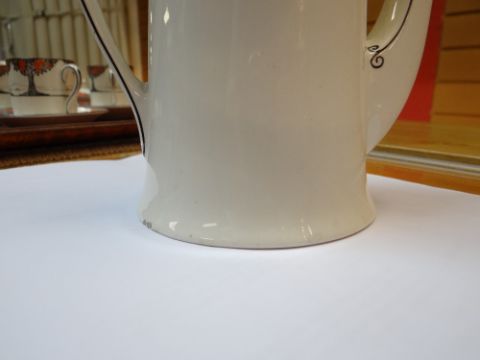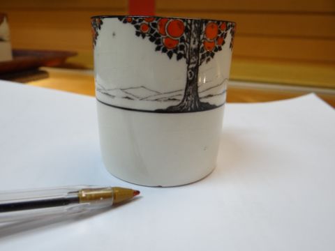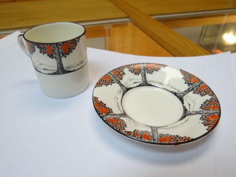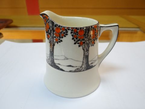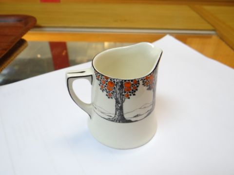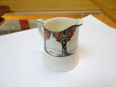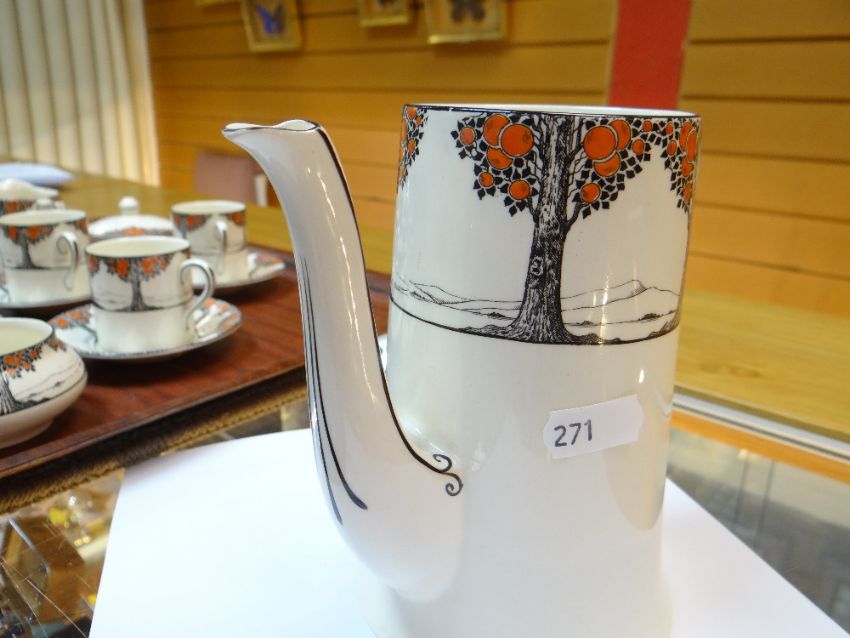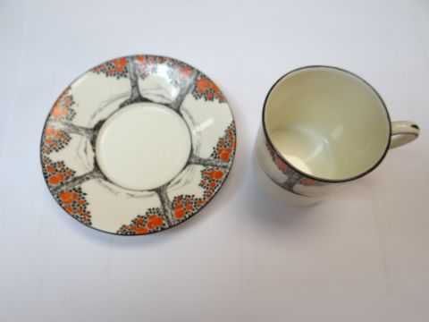 CROWN DUCAL ART DECO BONE CHINA COFFEE SET FOR SIX, pattern 'A1211', black printed and red enamelled orange tree design (15); and a Royal Albert 'Radium' bone china part teaset (27) Condition: teaset with some cracksThe teapot has two small chips on the bottom.The milk jug and the sugar bowl both look good.One saucer has a lot of crazing.One cup has a very faint hairline crack around the rim.One cup has a small chip to the base.