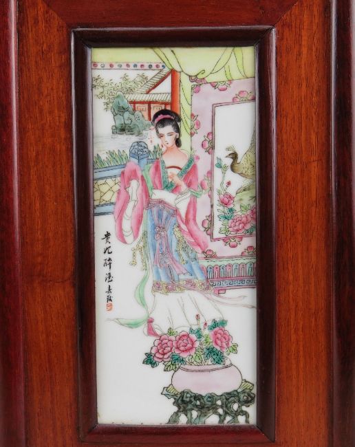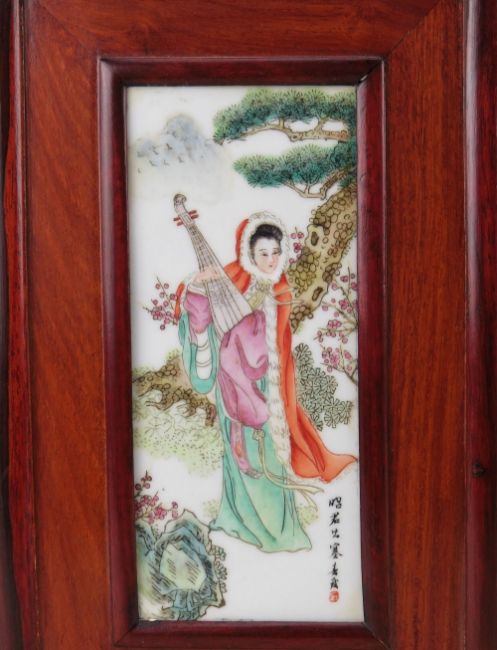 SET FOUR CHINESE FAMILLE ROSE PORCELAIN PLAQUES, painted with maidens in gardens beside pine, peony, willow etc, possibly allegorical for the seasons, 16.5 x 7cms, in rosewood frames, 26 x 16.5cms (4)