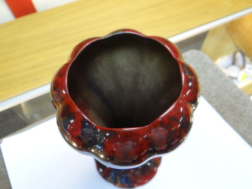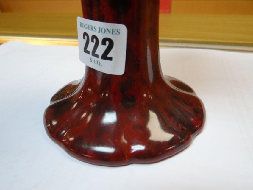ROYAL DOULTON FLAMBE TULIP VASE, printed marks to base, 18cms high, together with experimental black and white bottle vase of textured form, 26.5cms high (2)