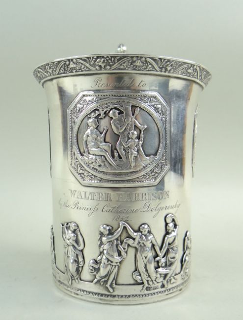 Auctioneer's Note: Ekaterina Mikhaïlovna Dolgoroukova (1847-1922) was a noblewoman who became the mistress of Tsar Alexander II, with whom she bore four illegitimate children in the 1870s. Walter Harrison was tutor to the four illegitimate children. Ekaterina subsequently married the Tsar in 1880. Cf. Christies 18 April 2008 lot 107 for a similar cup