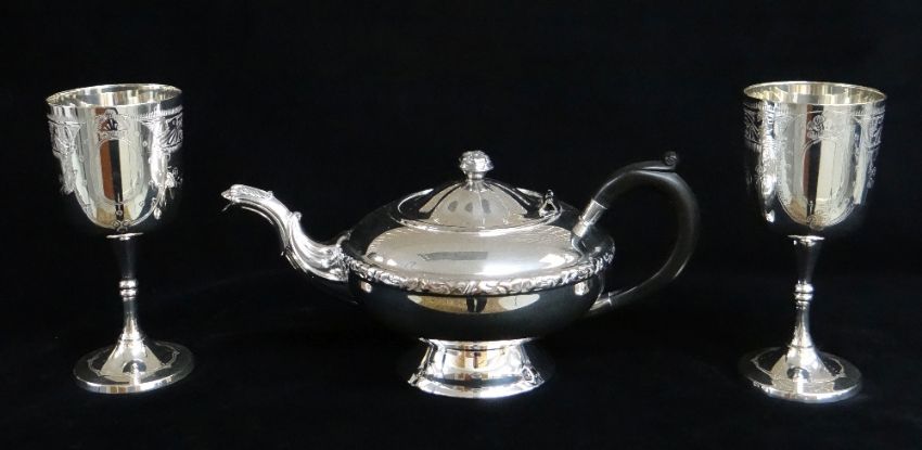 ASSORTED MODERN EPNS, including oval tea tray, four-piece tea and coffee set, and a pair of goblets (7)