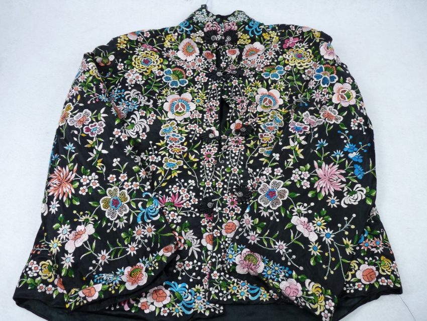 ORIENTAL SILK & EMBROIDERED JACKETS, Japanese painted parasol and two snakeskin type hand bags