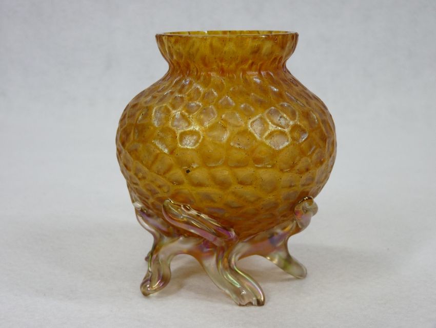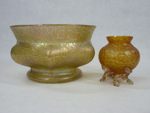 LOETZ TYPE IRIDESCENT GLASSWARE, TWO ITEMS - a 20cms diameter fruit bowl and a 10cms H bulbous vase