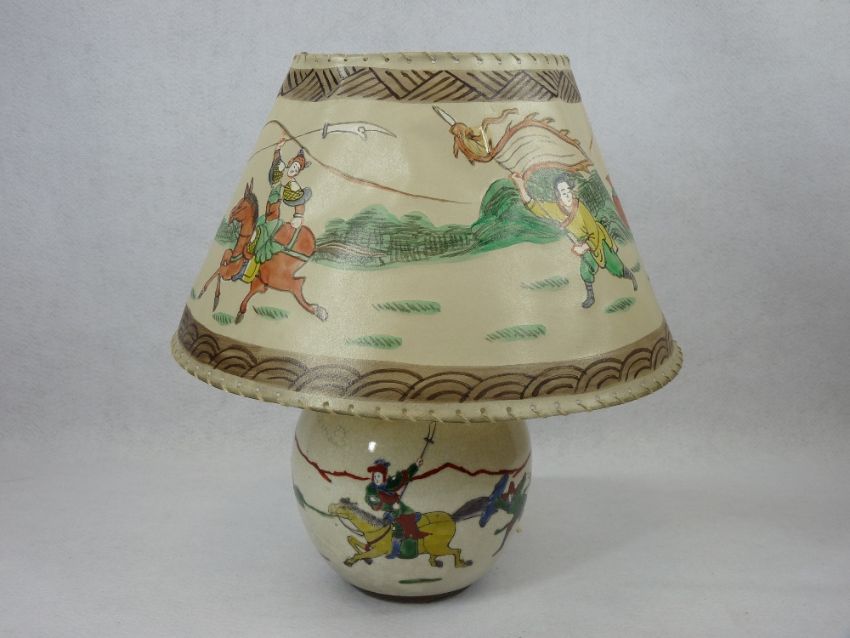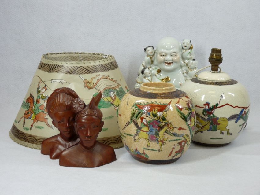 JAPANESE CRACKLE GLAZE PORCELAIN, modern Chinese Buddha figurine and two Balinese type carved wooden busts, the crackle glaze includes a ginger jar converted to a lamp with a shade painted to match