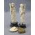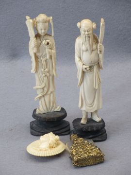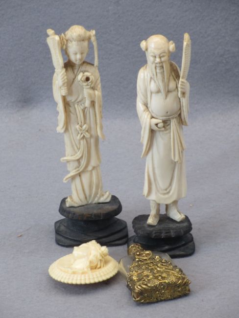 VICTORIAN CARVED IVORY BROOCH & OTHER COLLECTABLES to include two circa 1910 Japanese Okimono depicting a standing bearded gentleman with a fan and a standing lady holding a lotus flower and fan along with a gilt mounted scent bottle having a moon stone type setting to the cap (dip glass broken), 5 x 4.5cms, 15cm heights and 5.5 x 4cms measurements respectively