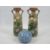A BLUE FLORAL DECORATED ARITA GLOBULAR BOWL - with knopped lid, 9cms diameter, 7cms H together with a pair of early 20th Century Satsuma twin-handled narrow neck vases with raised floral decoration, 21cms H, (extensive repairs to neck of one and repairs to one handle of the other)