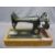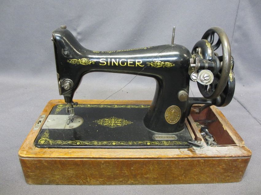 VINTAGE SINGER HAND CRANK SEWING MACHINE, CASED, wicker sewing basket and contents and a button upholstered box seat stool and contents