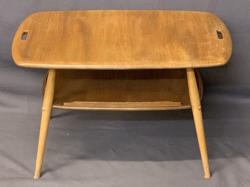 ERCOL LIGHT ELM BUTLER'S TYPE TABLE - the top having fret cut carry handles with under-tier shelf (one part side rail missing), on slender supports, original blue label attached, 44.5cms H, 72cms W, 44cms D