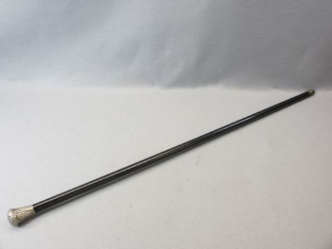 VICTORIAN EBONIZED WALKING CANE with unmarked white metal top, domed with multi-sectional floral panels in relief, 89cms L