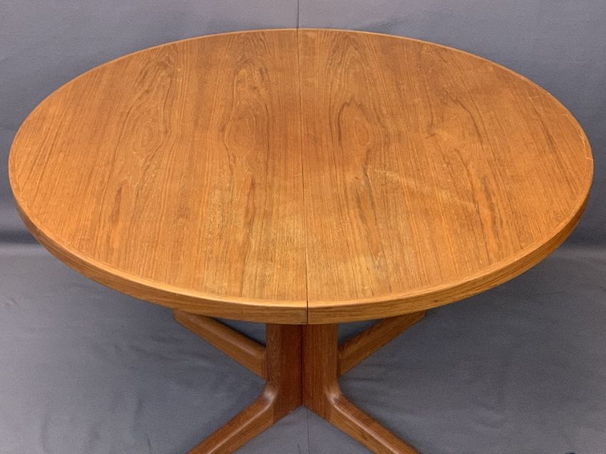 ROSENGAARDEN CIRCULAR TEAK EXTENDING DINING TABLE with two additional leaves and four modern upholstered dining chairs, 73.5cms H, 120cms diameter closed, the additional leaves, 50cms W each
