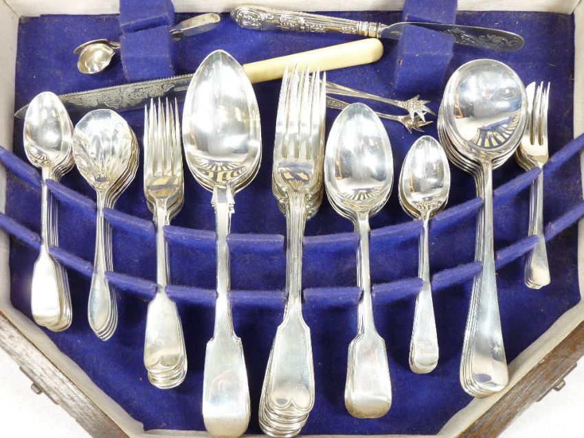 OAK CASED HARLEQUIN QUANTITY OF HALLMARKED SILVER FLATWARE and bone handled Sheffield plate knives, 60 pieces hallmarked, 81.5 ozt weighable to include 6 x 14.5cms teaspoons London 1838, 1853 and 1855, 6 x 14cms L desert spoons Sheffield 1953, 6 x 17cms table forks Sheffield 1933, 6 x 22.5cms serving spoons, four being Newcastle 1822, the other two London 1831, 6 x 20.5cms table forks, Fiddle & Thread pattern, London 1856, 6 x 18cms Fiddle pattern table spoons, Sheffield 1933, 6 x long handled teaspoons by James Orr Edinburgh, no date stamp, 6 x 19.5cms rat tail soup spoons Sheffield 1910, 6 x 12.5cms pastry forks, Sheffield 1931, two mustard spoons London 1833, pair of sugar tongs Sheffield 1923, chased decorated butter knife with Queens pattern handle Sheffield 1970 and a silver bladed bread knife Sheffield 1897