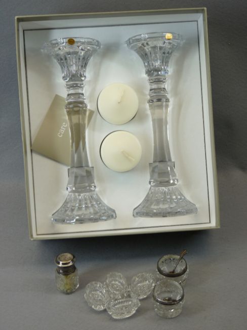 TIPPERARY CRYSTAL GLASS CANDLESTICKS, a pair boxed, salts (6) and a silver topped glass smelling salts bottle, one pair of salts silver mounted with hallmarked silver salt spoons included
