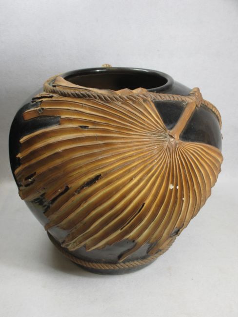 MIXED POTTERY & CHINA (2 boxes) plus a large pottery planter with applied palm leaf and rope detail