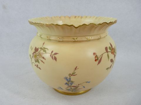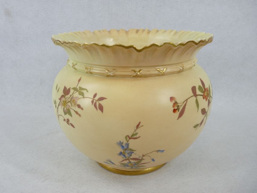 ROYAL WORCESTER PORCELAIN JARDINIERE - 1651 pattern, blush decorated with gilt highlighted floral sprays and fluted edge rim, printed marks in puce to the base, date marks for 1896, 20cms H, 22.5cms diameter to the rim (restorations)