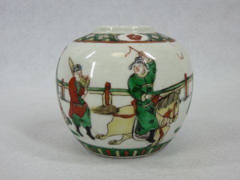 CHINESE PORCELAIN ORNAMENTAL WARE, 5 ITEMS - a pair of Blue & White Prunus Blossom vases, underglaze blue four character marks to the bases, Prunus jar and cover with cartouches of precious objects, Famille Verte decorated ginger jar and a circular tea bowl, 22.5cms, 11cms overall, 9.5cms and 4.5cms, heights respectively (the larger vases with damages)