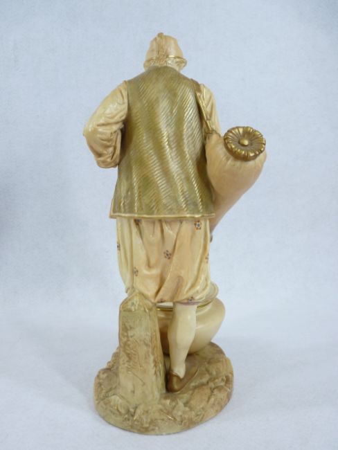 LARGE PAIR OF ROYAL WORCESTER FIGURINES BY JAMES HADLEY - depicting an Eastern man and woman in blush and painted gilt highlighted traditional clothing and both modelled tipping their water carriers into bowls at their feet on a rocky base, one has lift-out liner, the man with Hadley signature to the rear, impressed and printed in puce factory marks to the base, date marks for 1896, 32 and 30cm heights