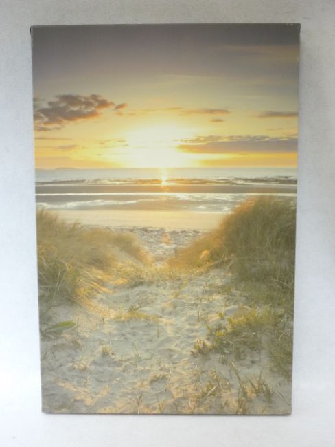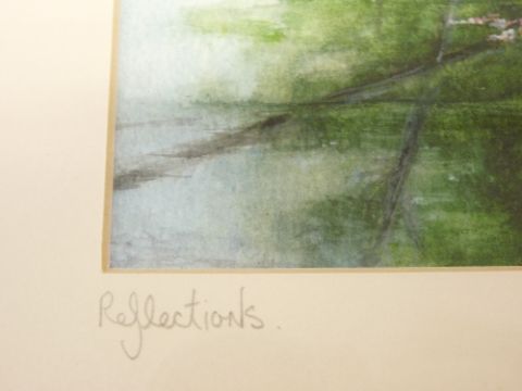 MIXED PICTURES & PRINTS (4) - W HEATON COOPER - 'Grasmere's Island Morning Sun', 17 x 24cms, TINA HOLLEY - 'Reflections', 27.5 x 39.5cms, box framed photographic canvas print - 'West Shore at Sunset', 76.5 x 51cms along with a vintage nail and thread picture of a spinner's wheel, 56 x 56cms