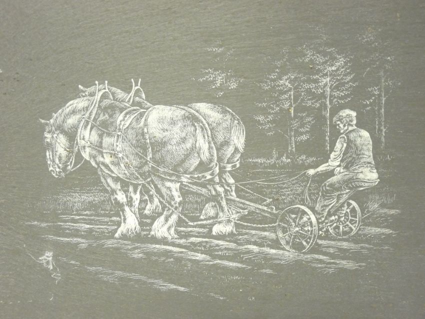 FRAMED PICTURES & PRINTS (4) - an oil on board of a prize bull, indistinct artist's initials, 34.5 x 44.5cms, Heywood Hardy pair of framed prints of hunt scenes titled 'The Start at The Manor' and 'The Finish', 17 x 25cms along with a slate picture of a farmer with vintage plough and shire team, 25.5 x 38cms