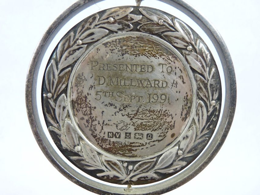 AUTOMOBILIA - Royal Society for The Prevention of Accidents Award, Birmingham 1990, maker's mark 'NV', EPNS mounted silver laurel leaf Driving Award with enamelled decoration presented to D Milward 5th September 1991 for '40 Consecutive Years of Safe Driving' mounted on a mahogany stand with plaque to the front, 21.5cms H