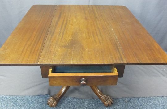 VICTORIAN MAHOGANY DROP LEAF PEDESTAL TABLE - single end drawer and opposing blind drawer with turned wooden knobs on a bulbous column and four claw carved feet, 73cms H, 106.5cms L, 53cms W closed, 106cms W fully open