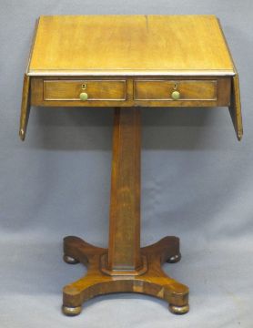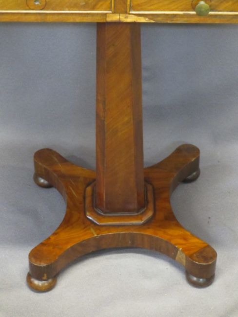 GEORGIAN MAHOGANY TWIN-FLAP OCCASIONAL TABLE - the moulded edge top over two opening and two dummy drawers with brass knobs (one lacking) on a segmented column and quatrefoil base on turned bun feet, 72cms H, 50cms W closed, 84cms open, 50cms D