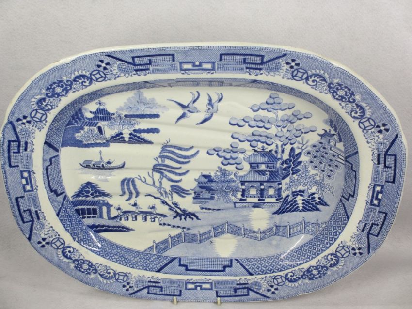 MIXED PEARLWARE & LATER WILLOW PATTERN PART DINNER SERVICE/DRESSER SET - 40 plus pieces by maker's including: Baker, Bevans & Irwin, Glamorgan Pottery Swansea; Dilwyn & Co; Evans & Glasson Swansea; Rogers; and others. The lot includes two large tureens and covers, 36 and 41cm lengths, one having pottery ladle, the other with EPNS, further items include a 52.5cms meat dish with well, five further meat platters, various sizes, dinner plates and side plates