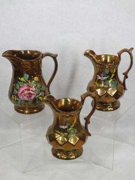 VICTORIAN COPPER LUSTRE WARE, 15 PIECES including diamond shape jugs with matching painted detail, teapot and cover with painted flowers in relief, ETC