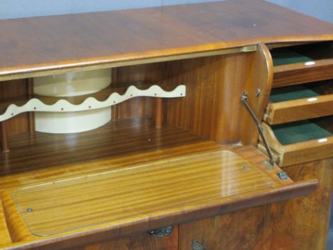 ART DECO STYLE WALNUT COCKTAIL SIDEBOARD with shaped drop-down front fall and decorative interior shelf, shaped door outer cupboards, one fitted with slides marked 'Knives, Forks & Spoons' over a serpentine base having two doors, one bearing label for 'Stonehill Furniture' the interior with shelving and single drawer on a serpentine base, 102cms H, 137cms W, 56cms max D