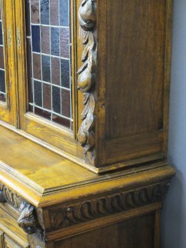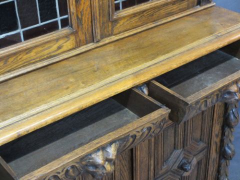 CONTINENTAL STYLE CARVED OAK BOOKCASE SIDEBOARD - with leaded coloured glass upper doors, lion mask, fruit and leaf and other carvings to a base section of two opening drawers and twin cupboard doors on a plinth base, 203cms H, 125cms W, 50cms D