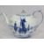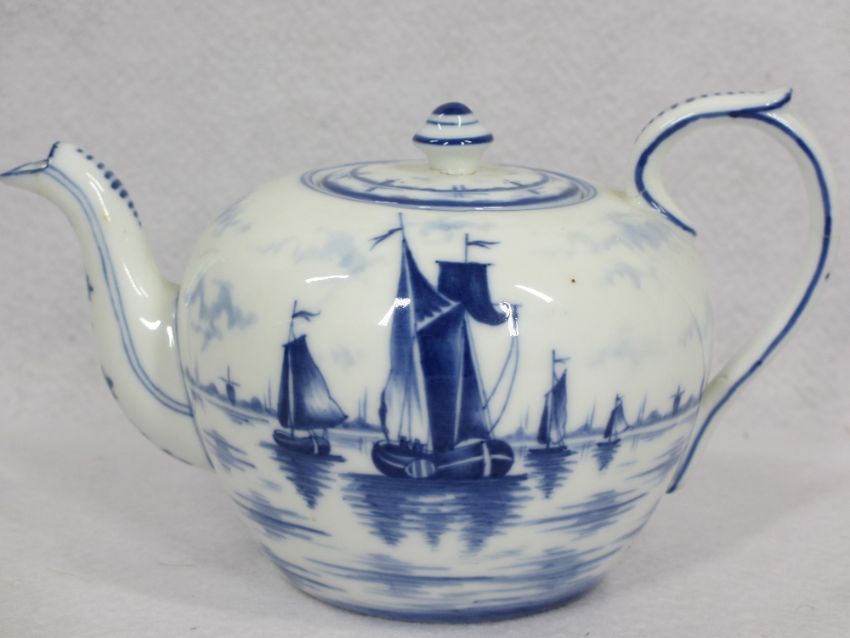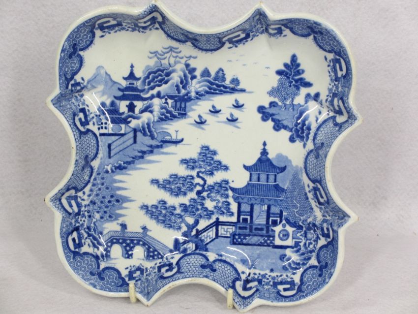 ANTIQUE PEARL WARE & OTHER BLUE & WHITE - a 20cms across pagoda with people on a bridge dish, pearl ware plate 25cms diameter, Oriental fence type pattern, flow blue jug with classical buildings and trees design, impressed 'South Wales Pottery' to the base, 14cms H, transfer decorated with pagodas jug marked 'W.T & Colandine' to the base, 17.5cms H, bullet shaped Dutch teapot and cover, 18cms across along with a large Copeland meat platter with transfer border in blue, 53.5 x 42.5cms, impressed and printed marks to the base