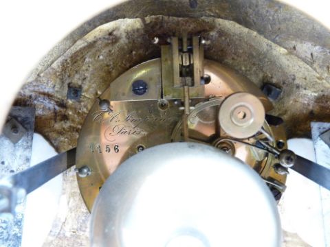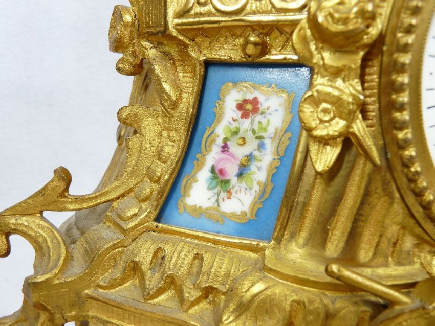 FRENCH 19TH CENTURY GILT METAL MANTEL CLOCK - marked 'Simpson & Co Paris' to the dial and movement having sevres style plaques flanking a white dial set with Roman numerals and twin winding apertures before a pendulum driven bell strike movement numbered 1156, the clock surmounted with a period dressed gentleman painter, pendulum and key included, 34.5cms H, 38cms across
