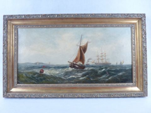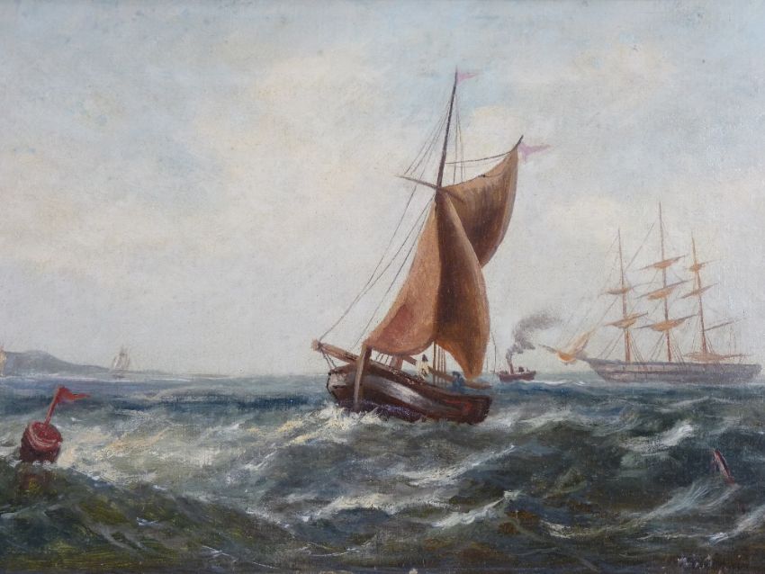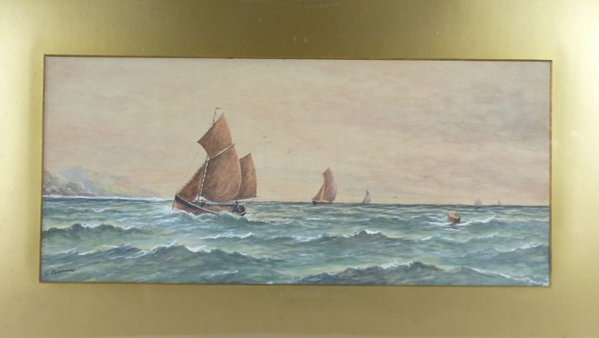 S BARNES watercolour - sea scape with numerous boats, signed, 23 x 52cms and J WILSON oil on canvas - A Three Master and other shipping in rough seas, signed lower right, 29 x 60cms