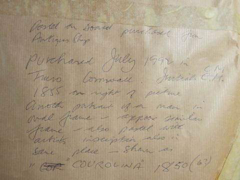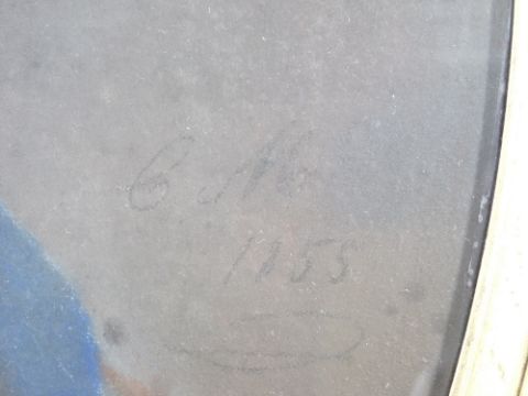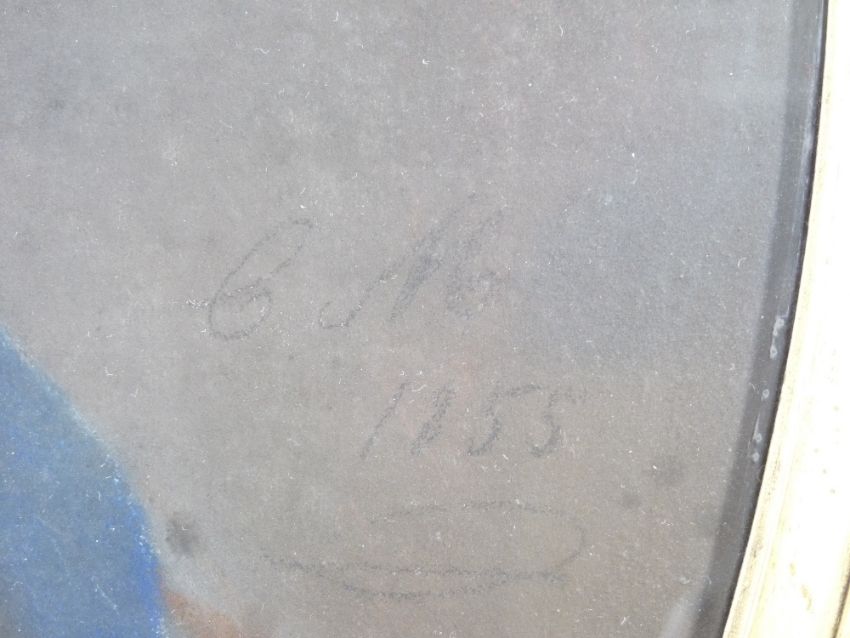 C M 19TH CENTURY SCHOOL - oval format, mixed media - Portrait of a Lady with blue hair ribbon and lacework neck to her dress, initialled and dated 1855 and with handwritten notes verso, 64 x 52cms