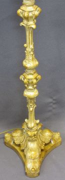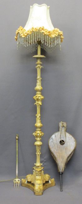 ROCOCO STYLE GILT DECORATED STANDARD LAMP WITH SHADE, vintage oak fire bellows and an extending brass toasting fork, 152cms overall H the lamp