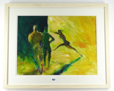 TOM NASH acrylic - two standing ballet dancing figures in the wings as another leaps on stage, signed, 35 x 48cms
