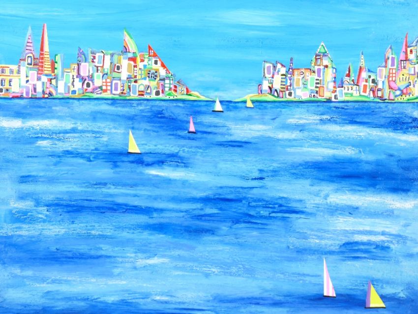 DANIEL MEAKIN mixed media on box canvas - abstract, entitled 'Summertime Sailing', signed and dated 2021, 50 x 50cms