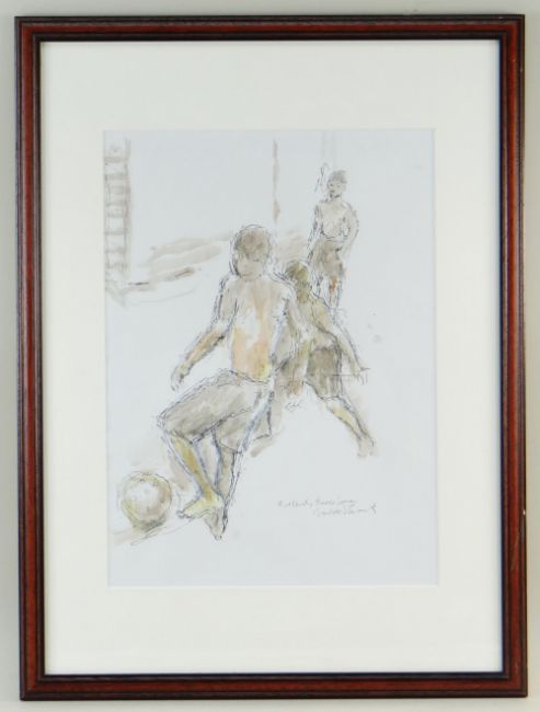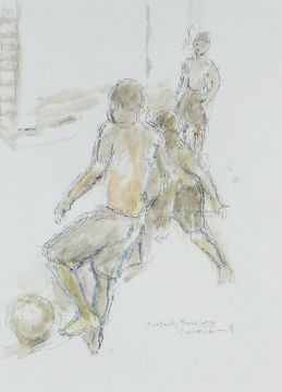 GORDON STUART mixed media - three figures, entitled 'Football, Barcelona', signed, 39 x 29cms