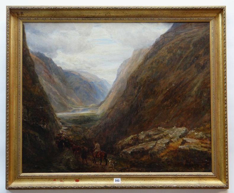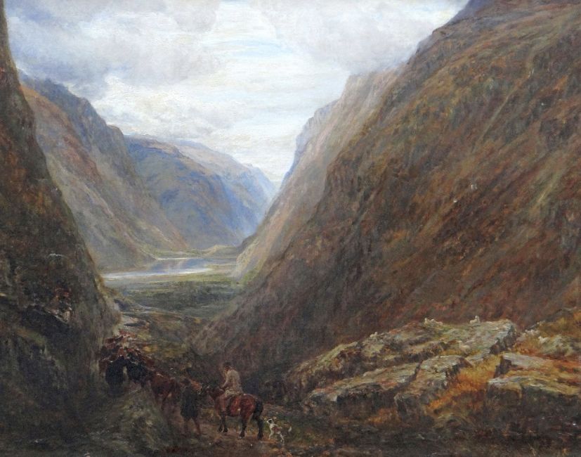 CHARLES THOMAS BURT oil on canvas - dramatic Welsh landscape with drovers on horse and foot moving cattle, Llanberis Pass, signed and dated 1873, 70 x 87cms
