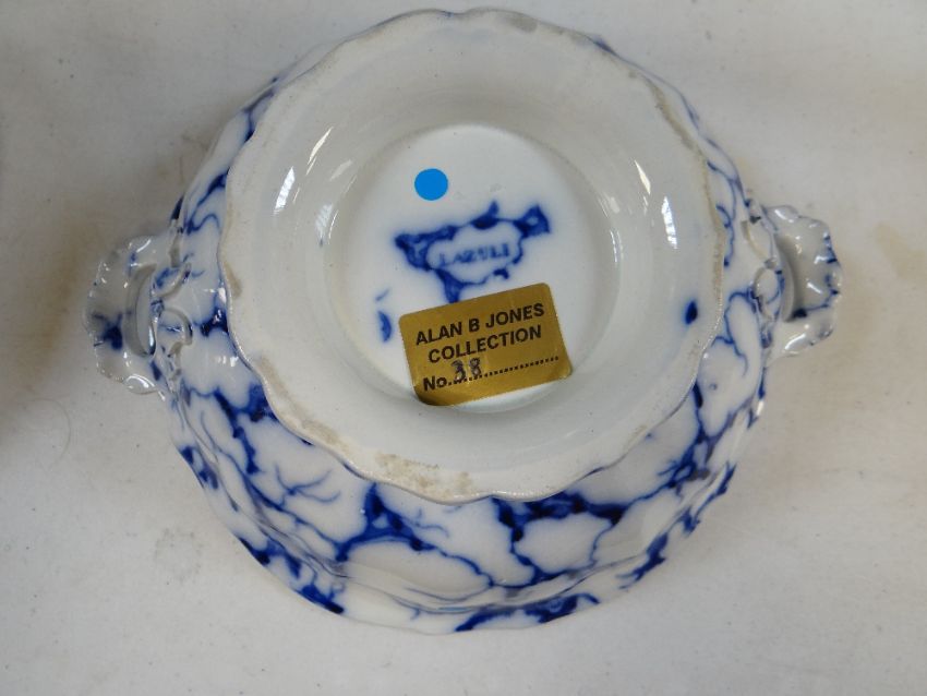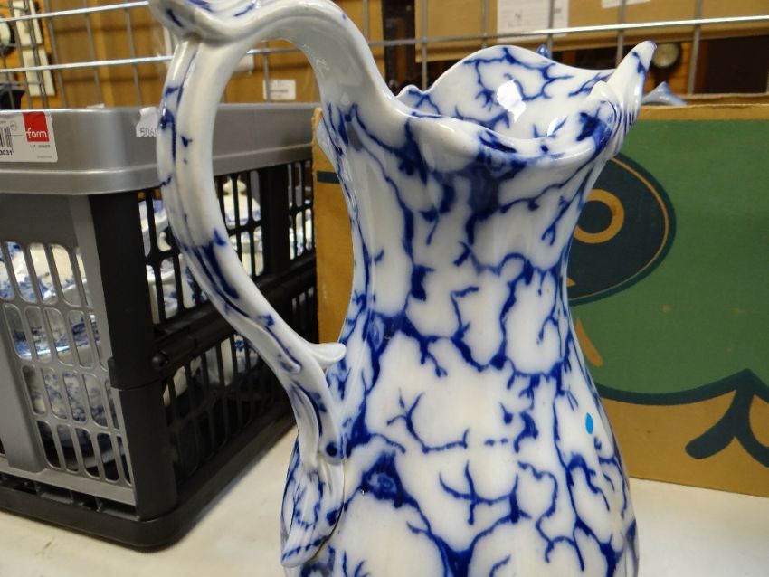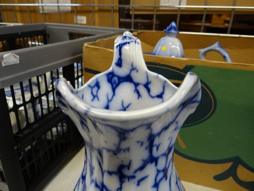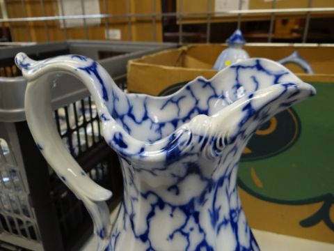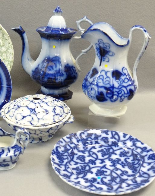 VARIOUS FLOW-BLUE BLUE DECORATED WELSH POTTERY including Ynysmeudwy 'Rio' coffee-pot, Cambrian 'Lazuli' patterned toilet-jug and matching sponge-bowl and cover, three plates etc (10)