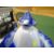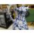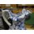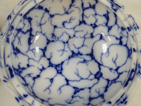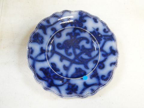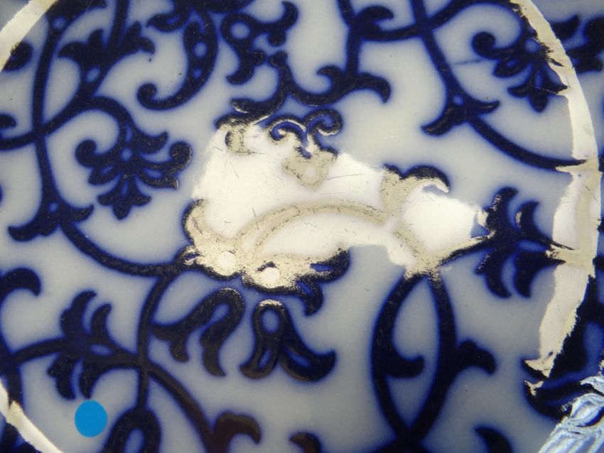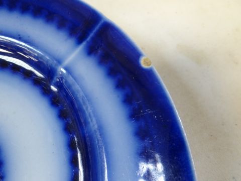 The large blue plate has a chip around the rim and lots of surface scratches.