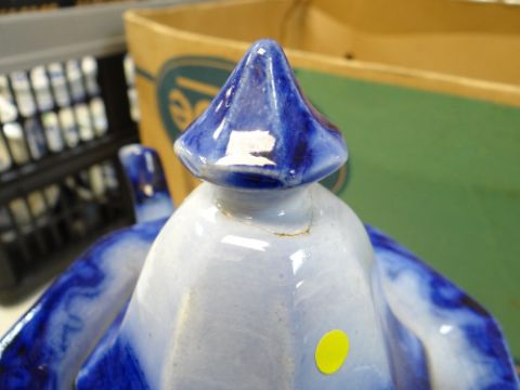 The large teapot has a chip on the spout, the finial has been restored, there are hairline cracks and restoration to the base. There is also a star-shaped hairline crack on the inside base.