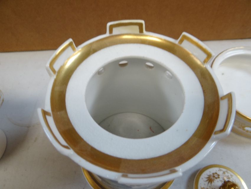 A WELSH LANDSCAPE ENGLISH PORCELAIN VEILLEUSE (tea-pot and warming stand) comprising miniature teapot over a tapered castle turret heating-stand and with circular base, gilded and decorated with views including Oystermouth Castle and Mumbles Head and Glenmire Bridge, Cork (titles to base of teapot) possibly painted by Philip Ballard at the London workshop of J Bradley & Co, circa 1820, 22cms high (assembled),
