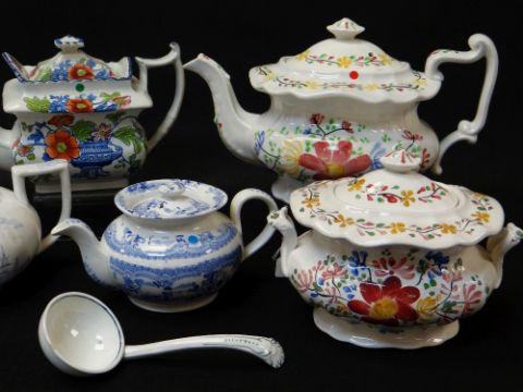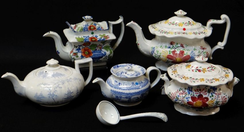 FOUR ANTIQUE WELSH POTTERY TEAPOTS, blue and white transfer, coloured transfer and hand decorated together with tureen and ladle (5)