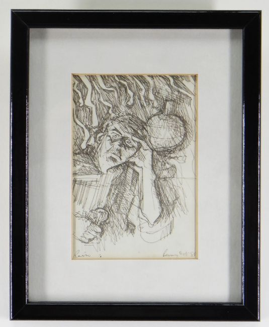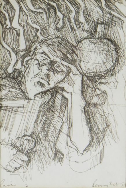 ALAN PERRY pen and ink - figure, entitled 'Rain' and with inscription verso 'A free sketch for you what Jean calls my Dracula Mood', signed and dated 1988, 14 x 10cms