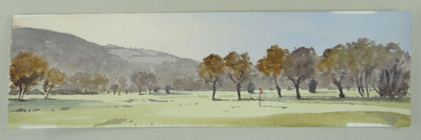 GARETH THOMAS watercolour on paper - four landscapes of UK and European views, two signed, all unframed, largest lot 12.9 x 38.7cms (companions similar size)