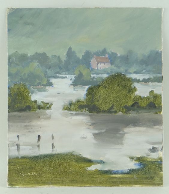 GARETH THOMAS oil on board - landscape with house, signed, unframed, 27 x 23cms