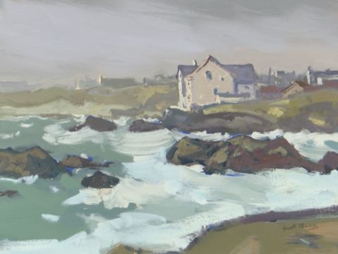 GARETH THOMAS oil on board - Welsh coastline with houses, signed, unframed, 24.5 x 32cms