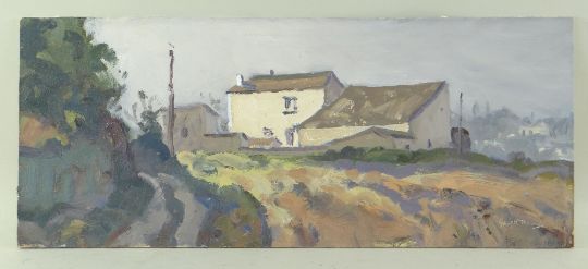 GARETH THOMAS oil on board - house by countryside path, signed, unframed, 18.4 x 44cms